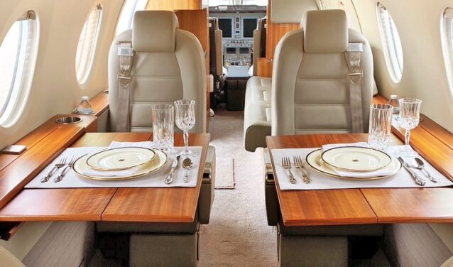 Ce jet privé a une capacité d’accueil de 6 à 7 passagers. La configuration des sièges comprend des clubs pour quatre passagers ainsi qu’un divan pour trois personnes.